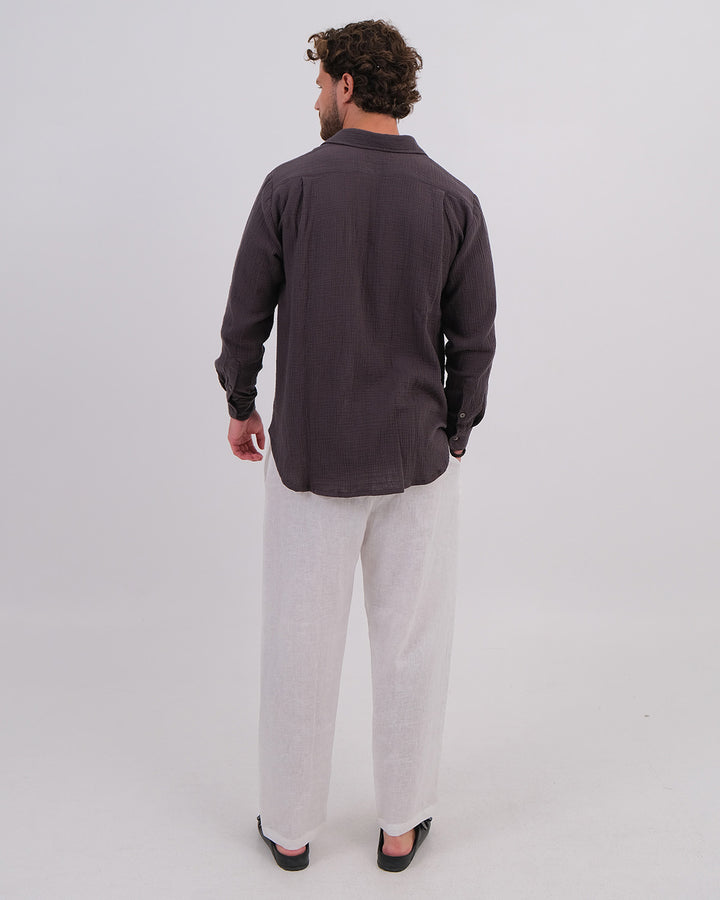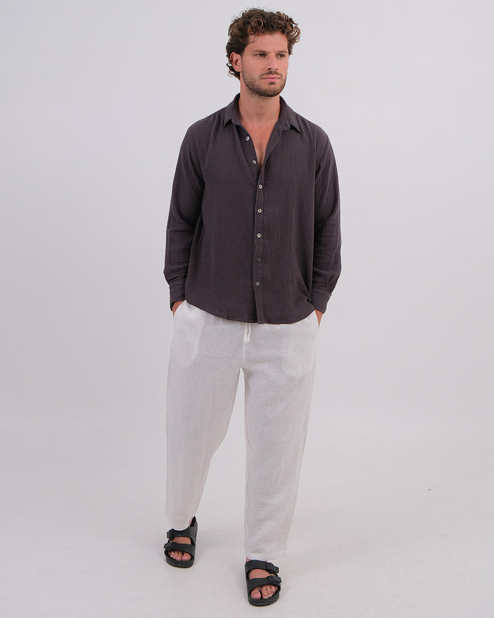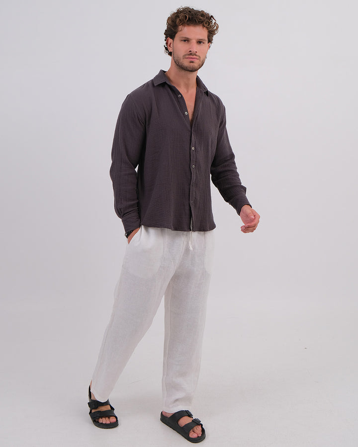 Men Shirt Collar Cotton Bubble Black & Long Pant Linen 100% White