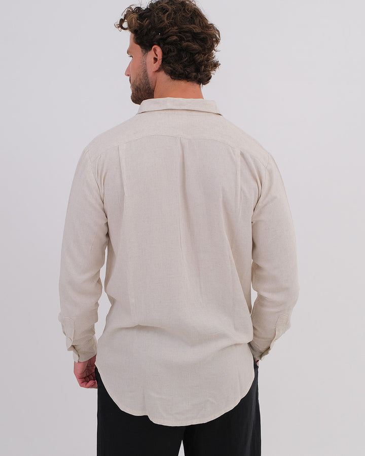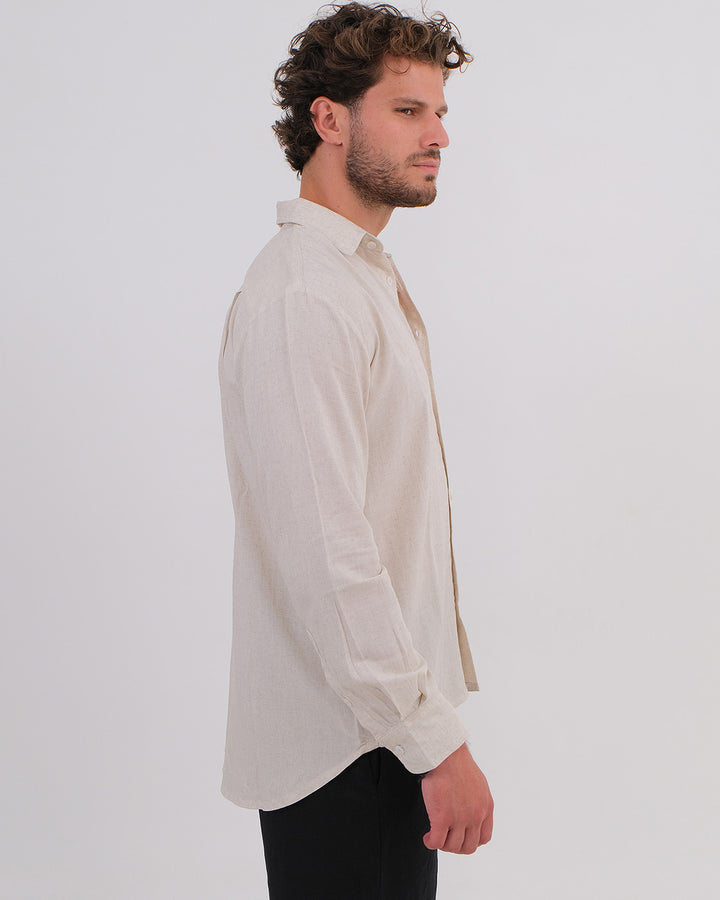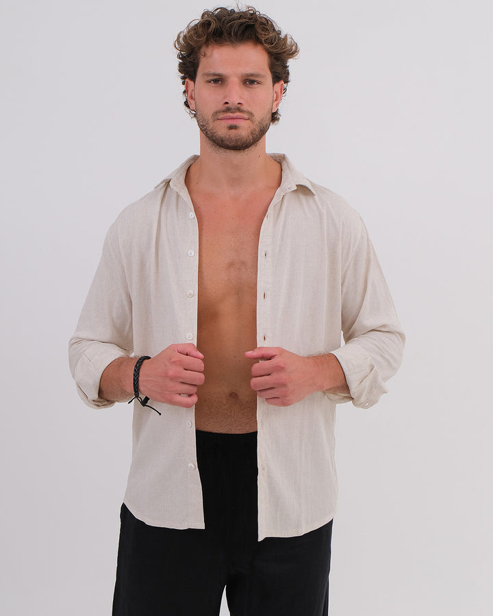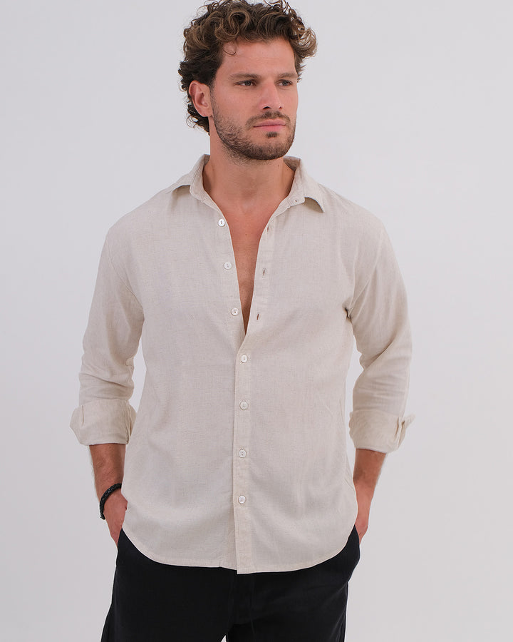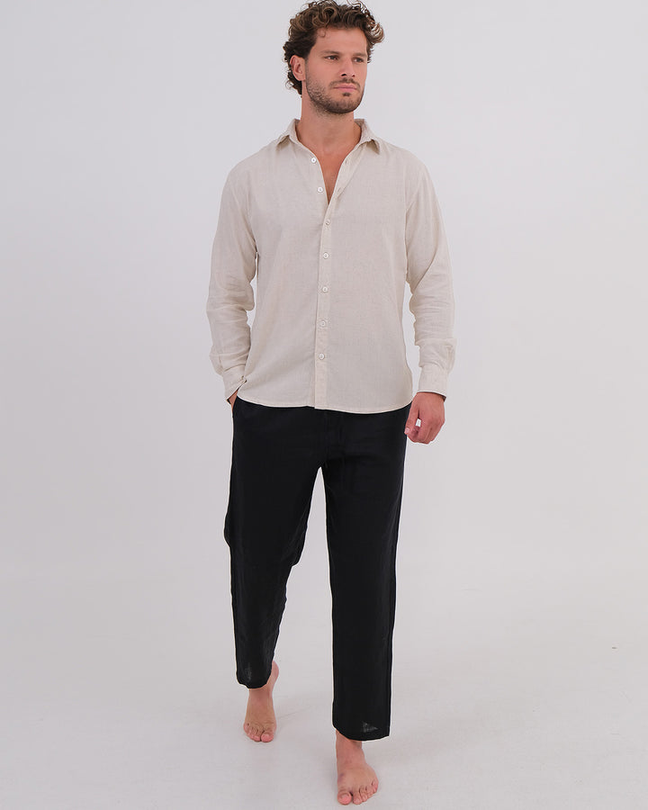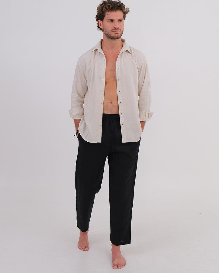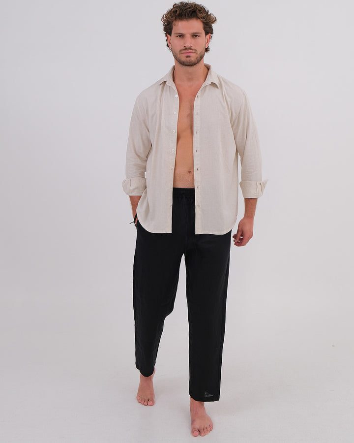 Get ready to turn heads with this cool combo: a natural-toned linen-rayon shirt featuring a sharp collar, paired with sleek, long black linen pants. Lightweight and breathable, this outfit keeps you comfy while adding a dash of effortless style.