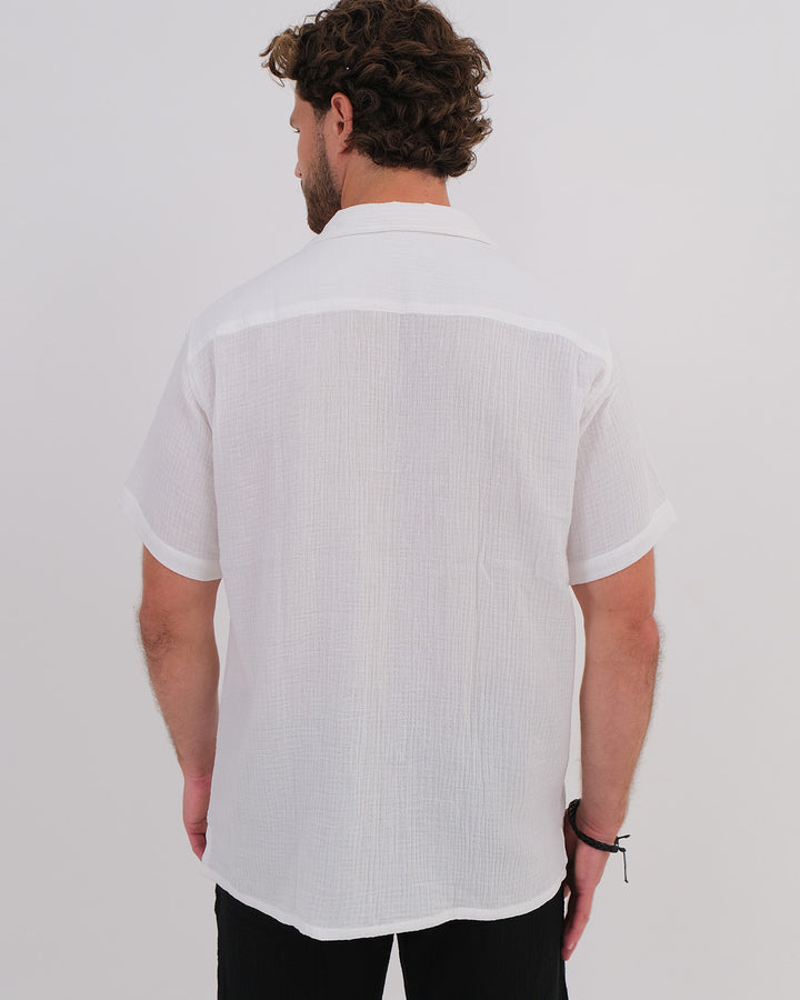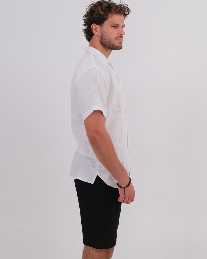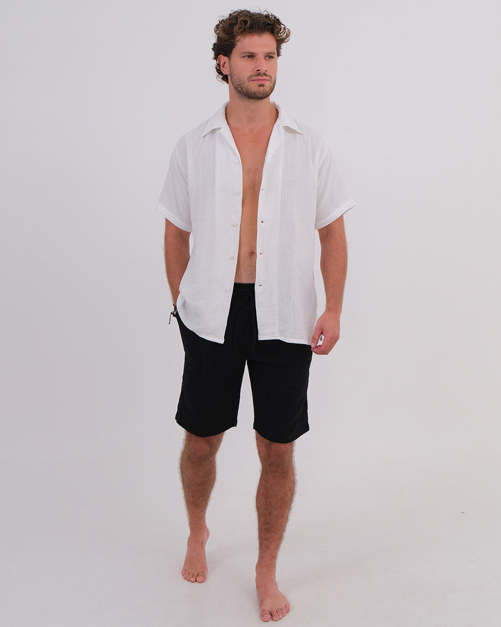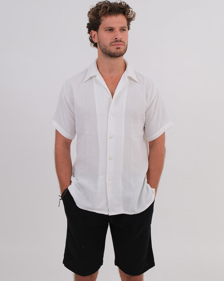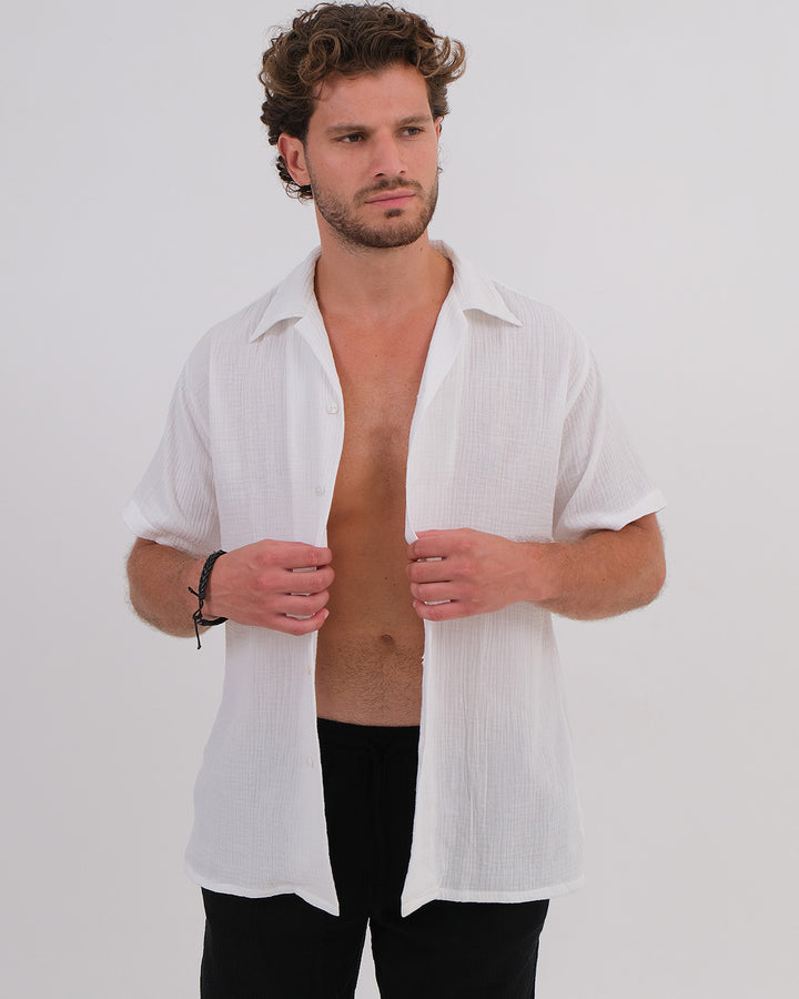 Get comfy and stylish with our Man Shirt Short Sleeve Cotton Bubble in Offwhite, featuring a breezy, soft texture perfect for any casual day. Pair it effortlessly with the Unisex Short Cotton Bubble in Black, designed for ultimate comfort and a playful, relaxed vibe. Easygoing outfits that keep you feeling cool and looking sharp!