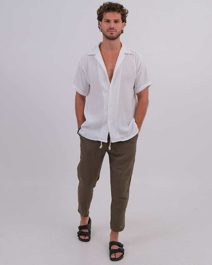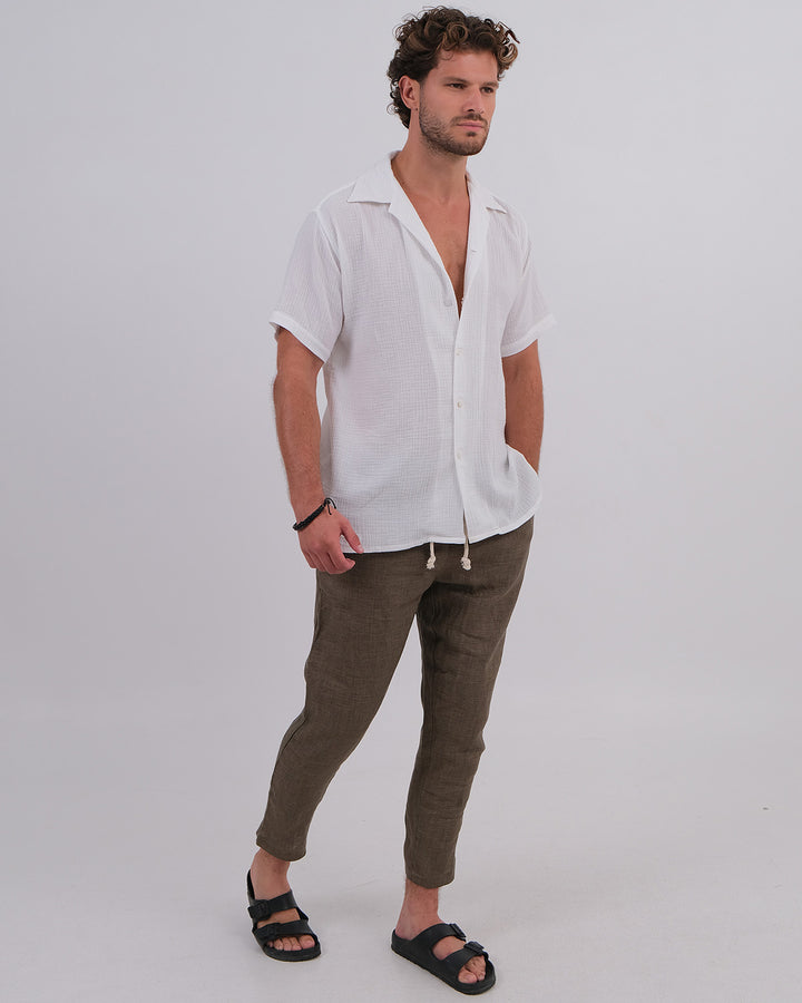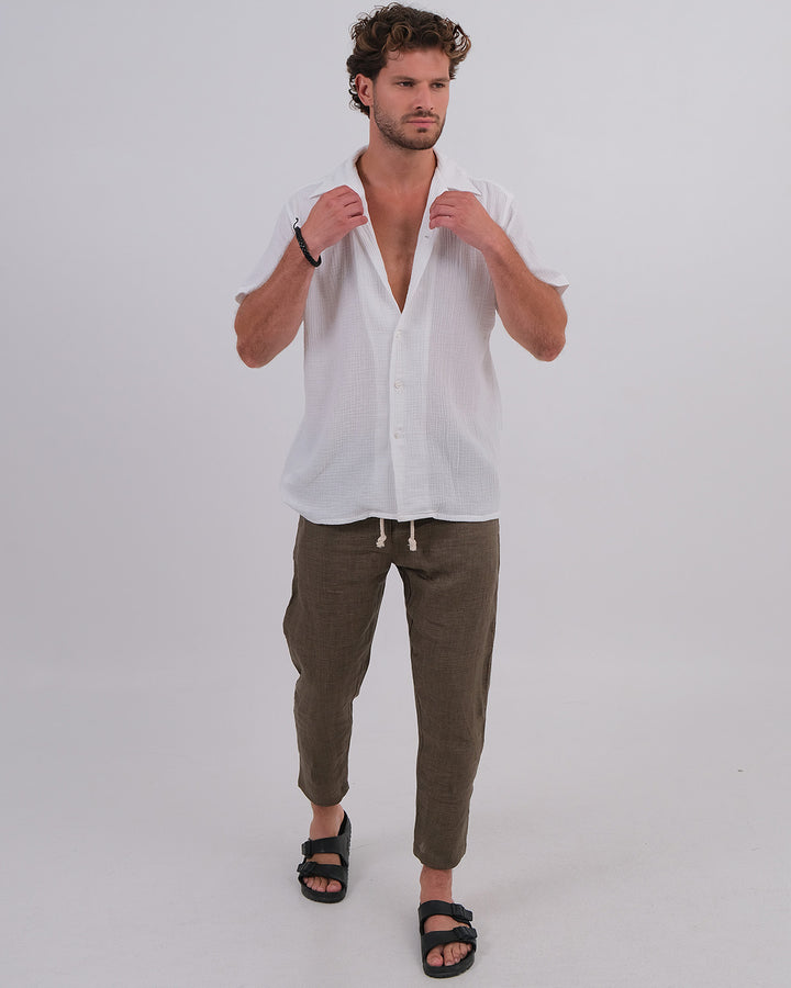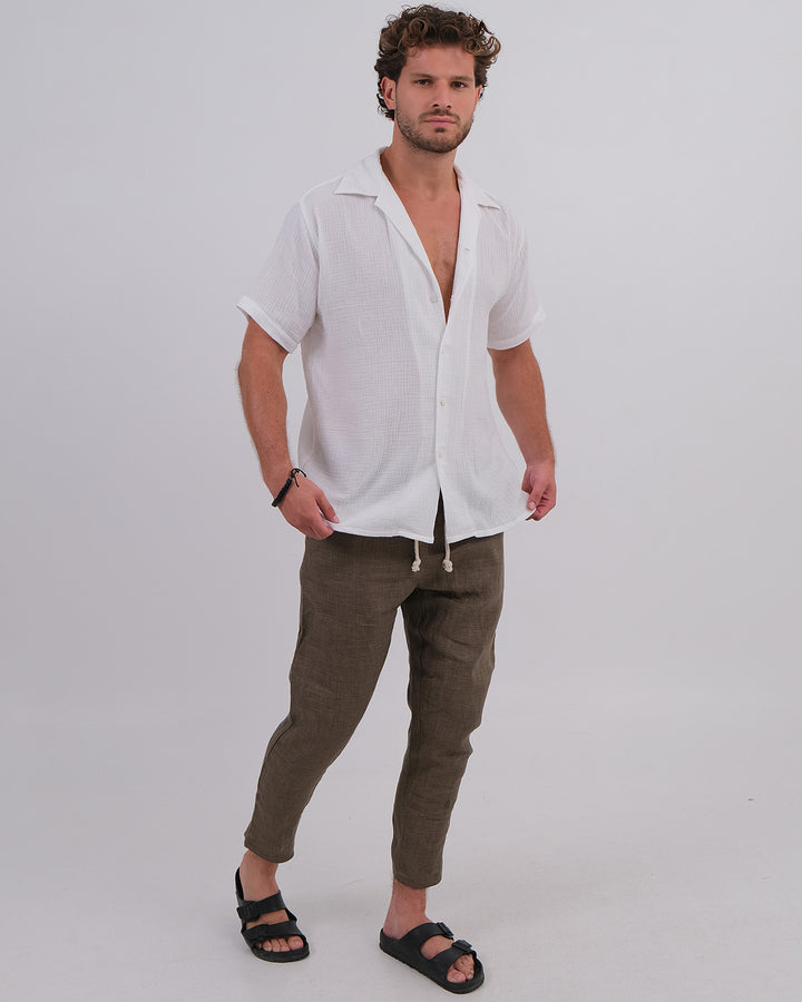 Keep it fresh and fun with this stylish combo! The white short-sleeve cotton bubble shirt is soft and breathable, perfect for warm days. Pair it with the 100% khaki linen Thomas pants for a relaxed, easygoing look that’s ready for any casual adventure.