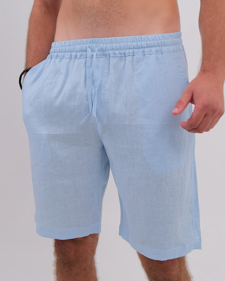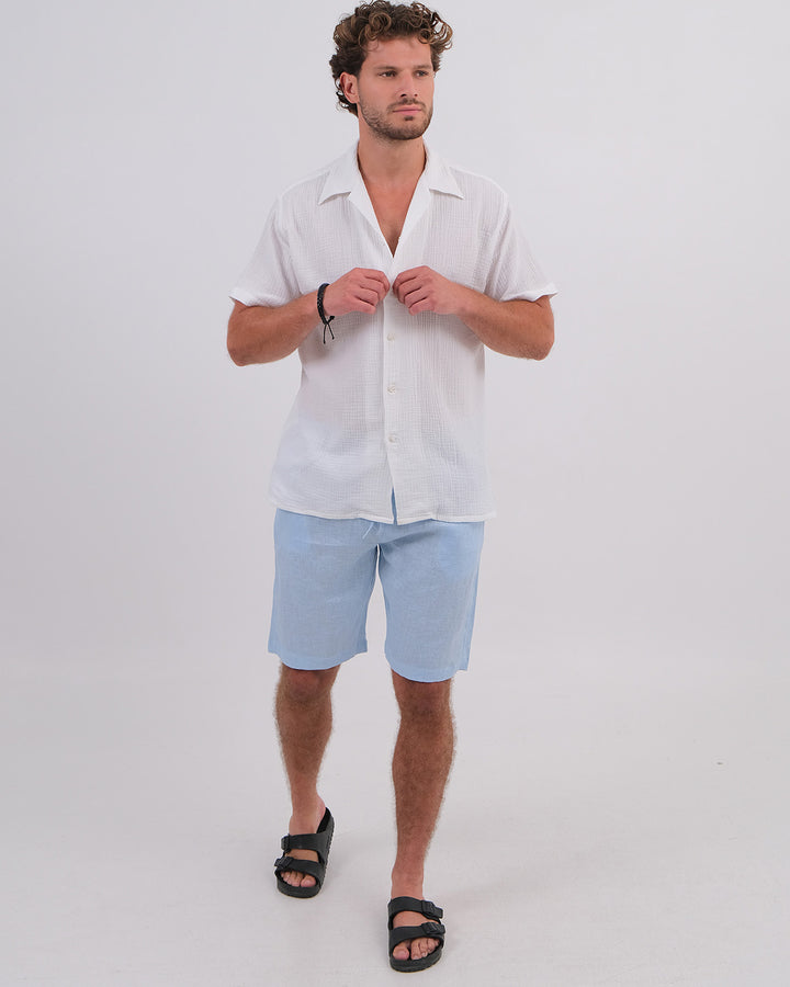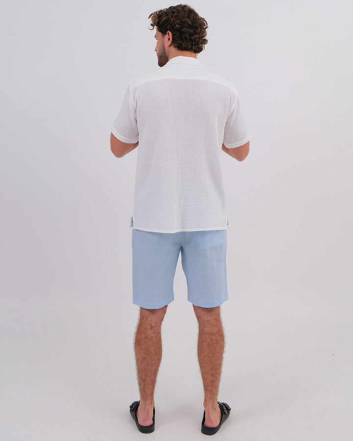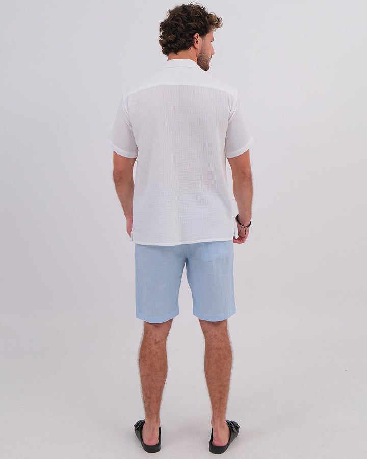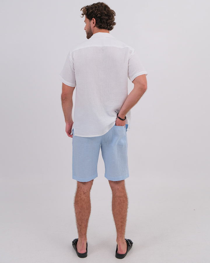 Stay cool and casual with this spirited pair! Featuring a crisp white short-sleeve cotton bubble shirt and unisex 100% linen shorts in refreshing ice blue, this outfit is your ticket to playful comfort. Perfect for sunny days when you want to feel light, breezy, and ready for anything fun.
