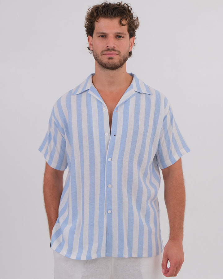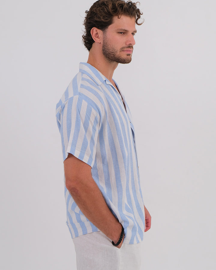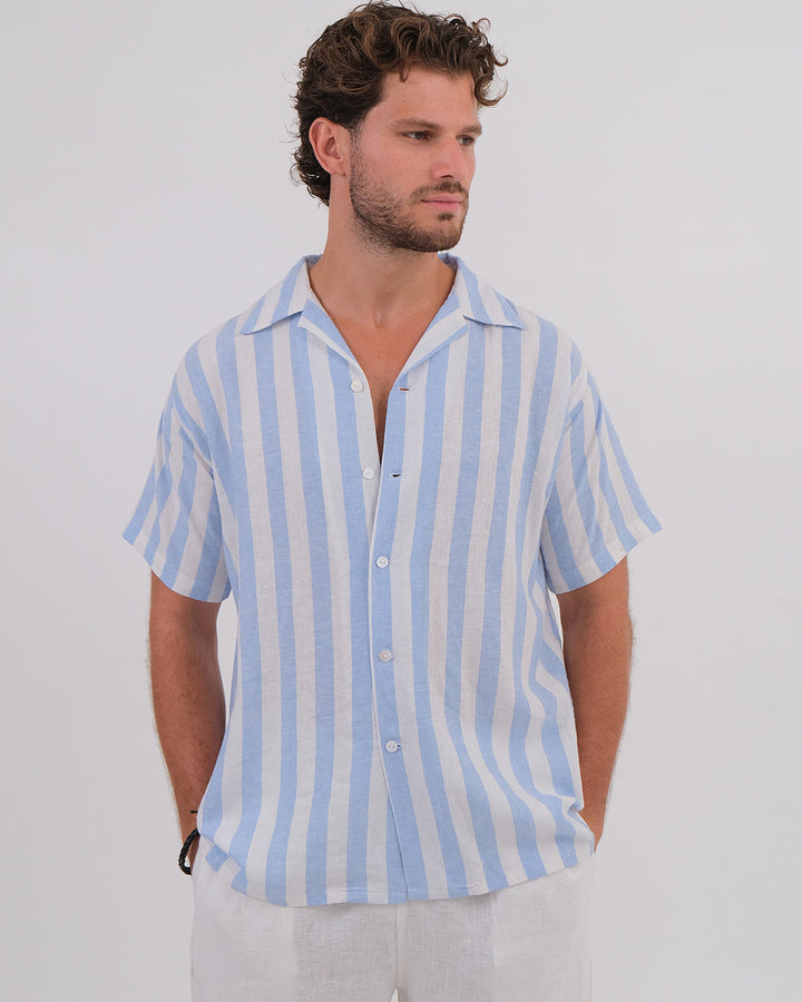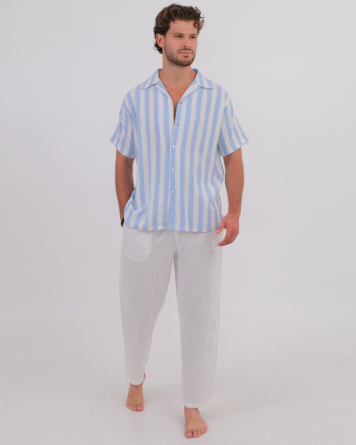 Bring a burst of fresh style with this playful linen set! Featuring a short sleeve salur blue shirt and white linen pants, both made from 100% breathable linen. Perfect for keeping cool while looking sharp on any sunny day or casual hangout.