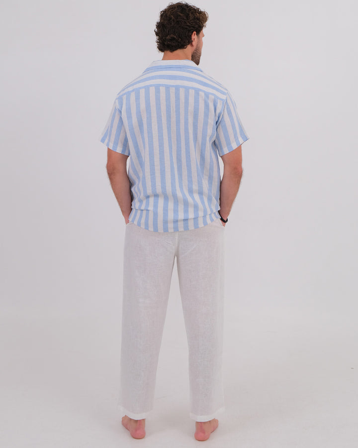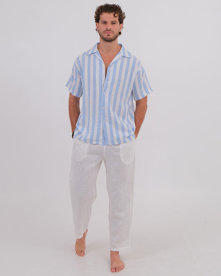 Men Shirt Short Sleeve Linen 100% Salur Blue & Long Pant Linen 100% White