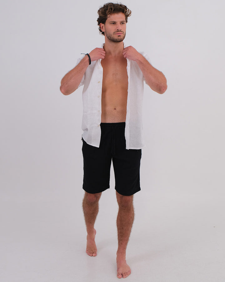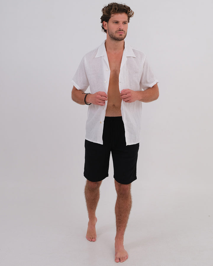 Bring fresh vibes to your outfit with this playful pair: a crisp white linen short-sleeve shirt made for men, teamed with cozy unisex black cotton bubble shorts. Light, breathable, and fun, this combo keeps you cool and ready for anything sunny days throw your way!