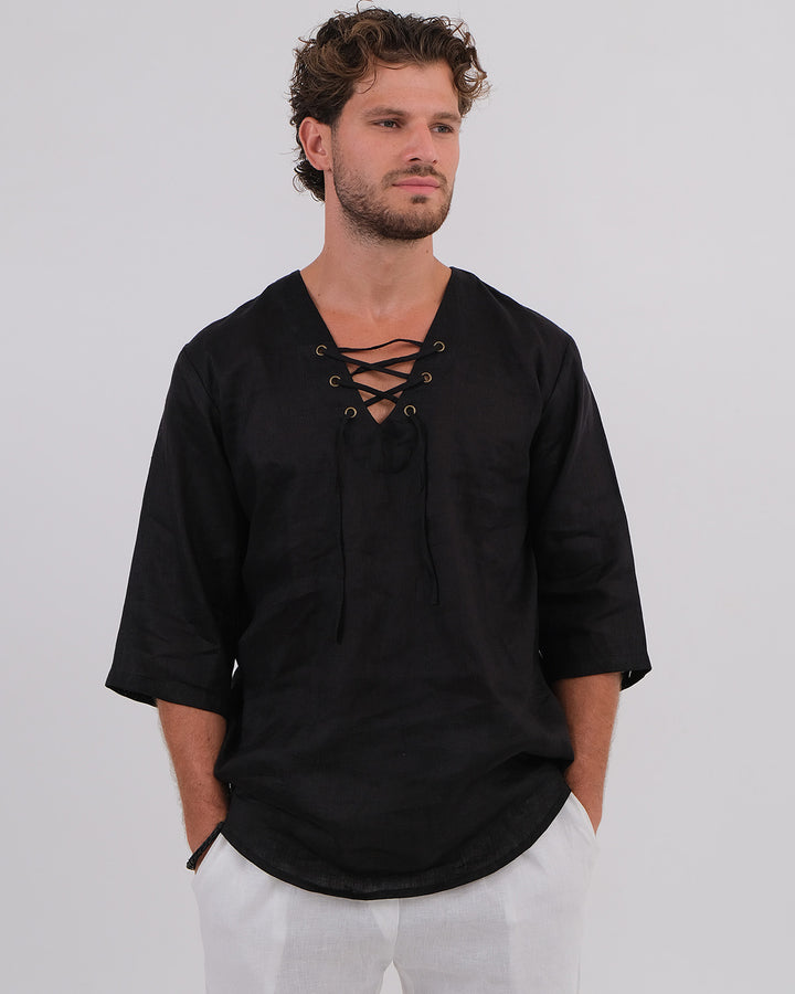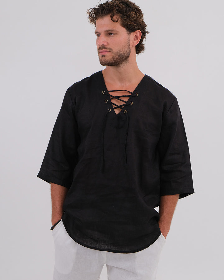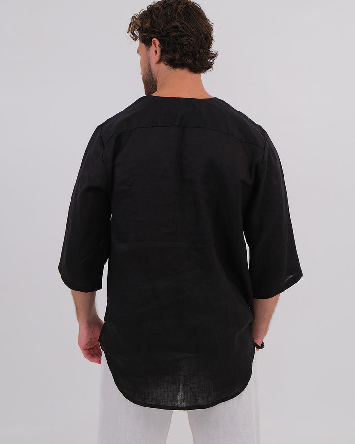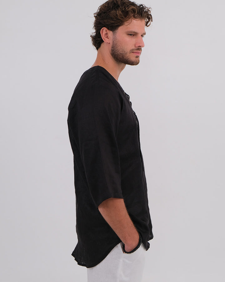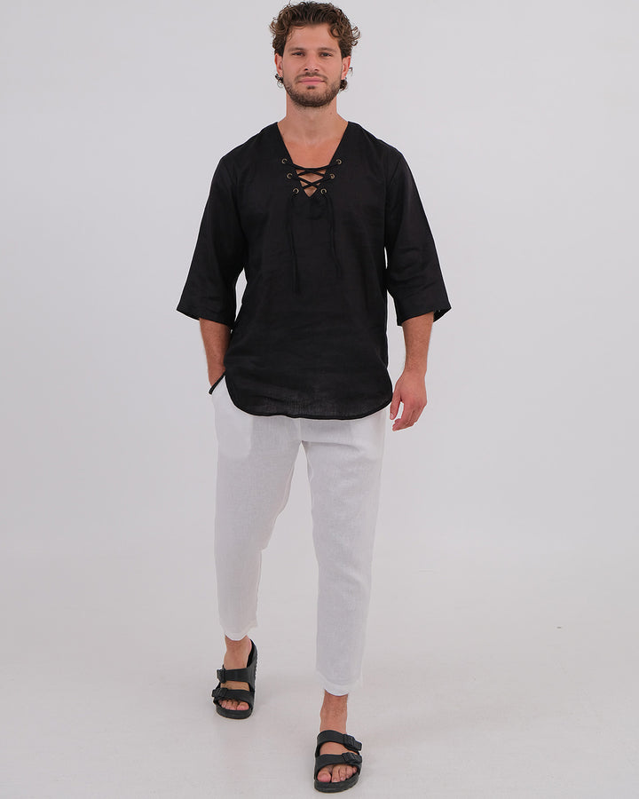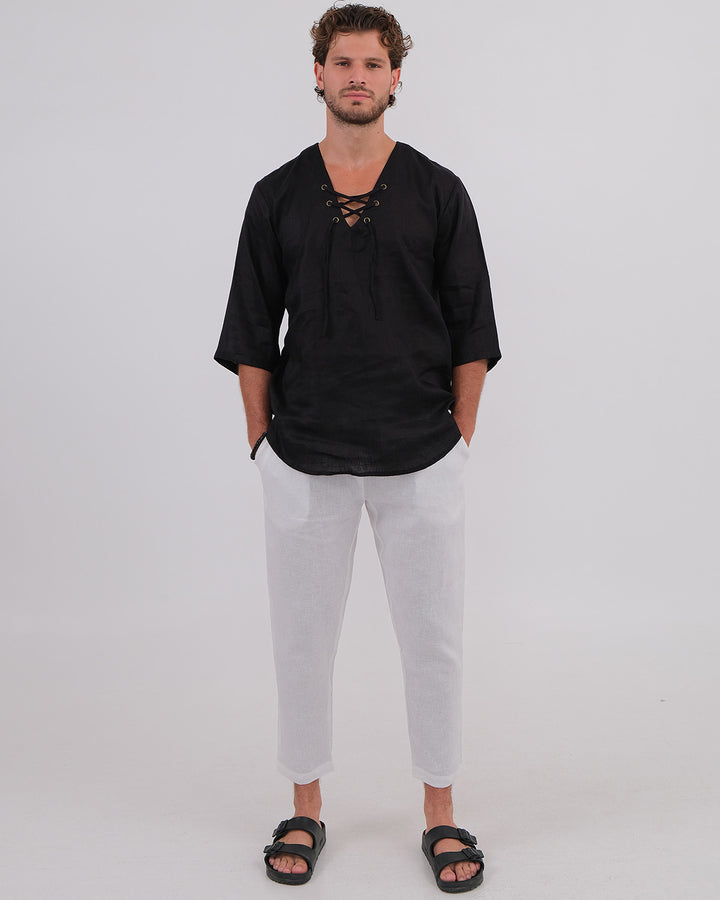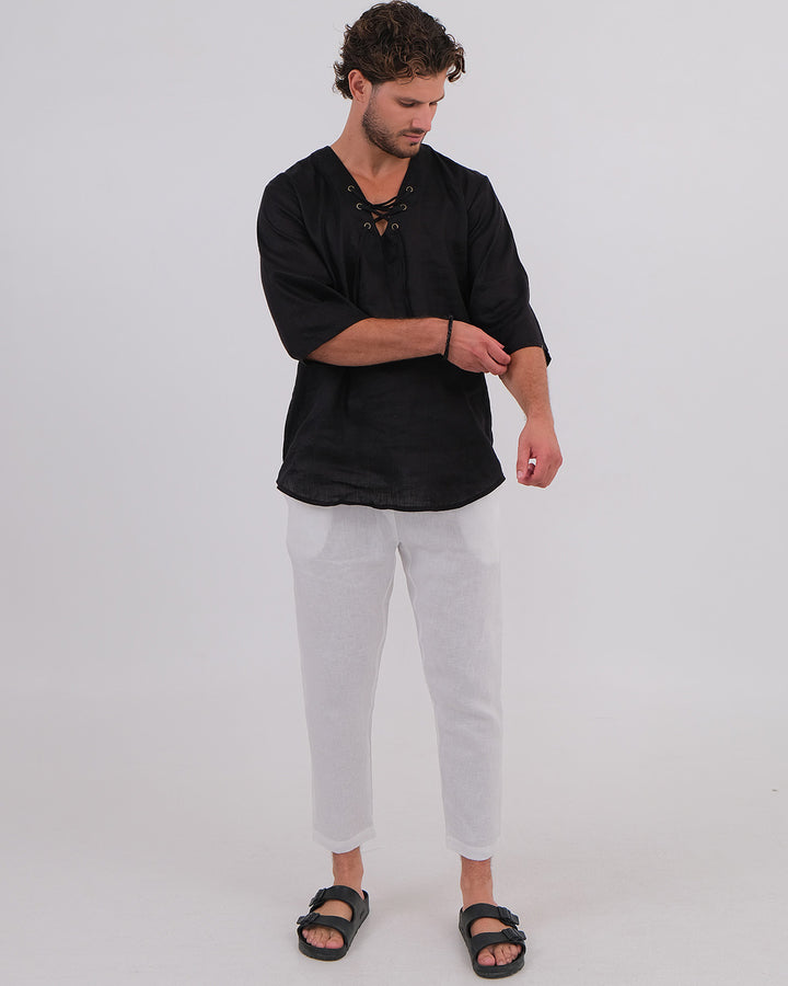 V-Neck Shirt Linen 100% Black & Thomas Pant Linen 100% White