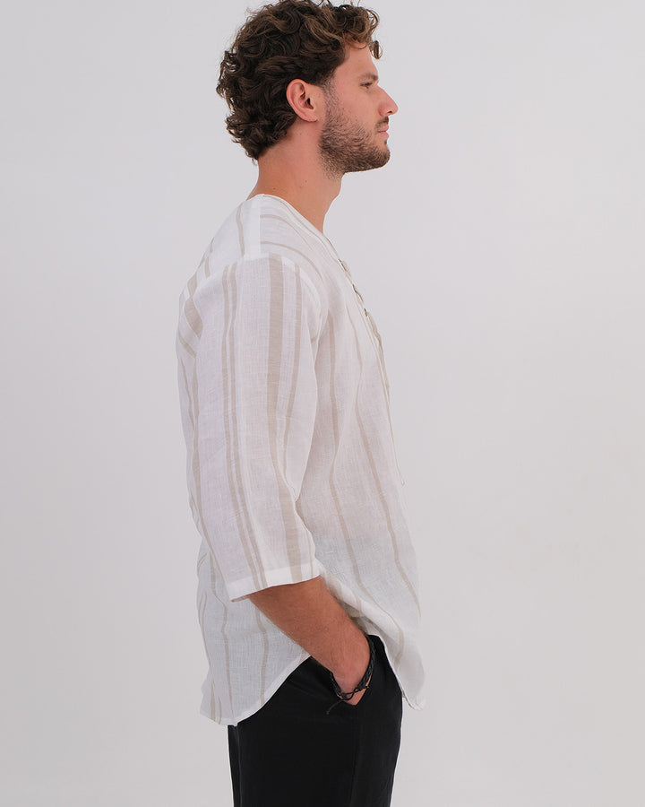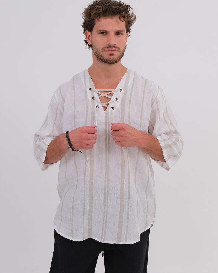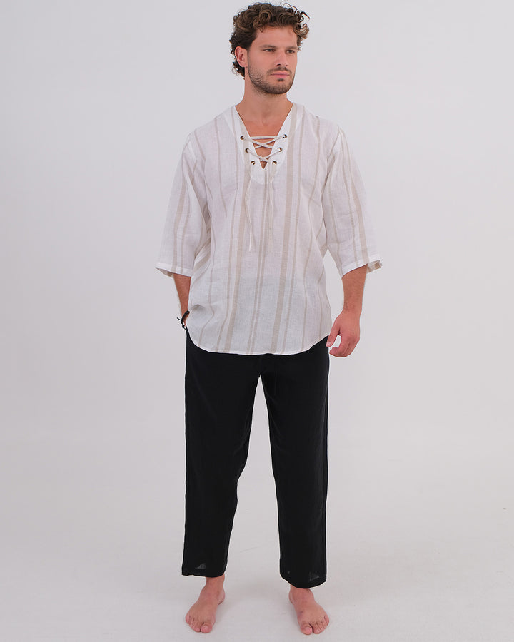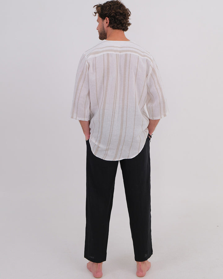 V-Neck Shirt Linen 100% Stripes Beige & Long Pant Linen 100% Black