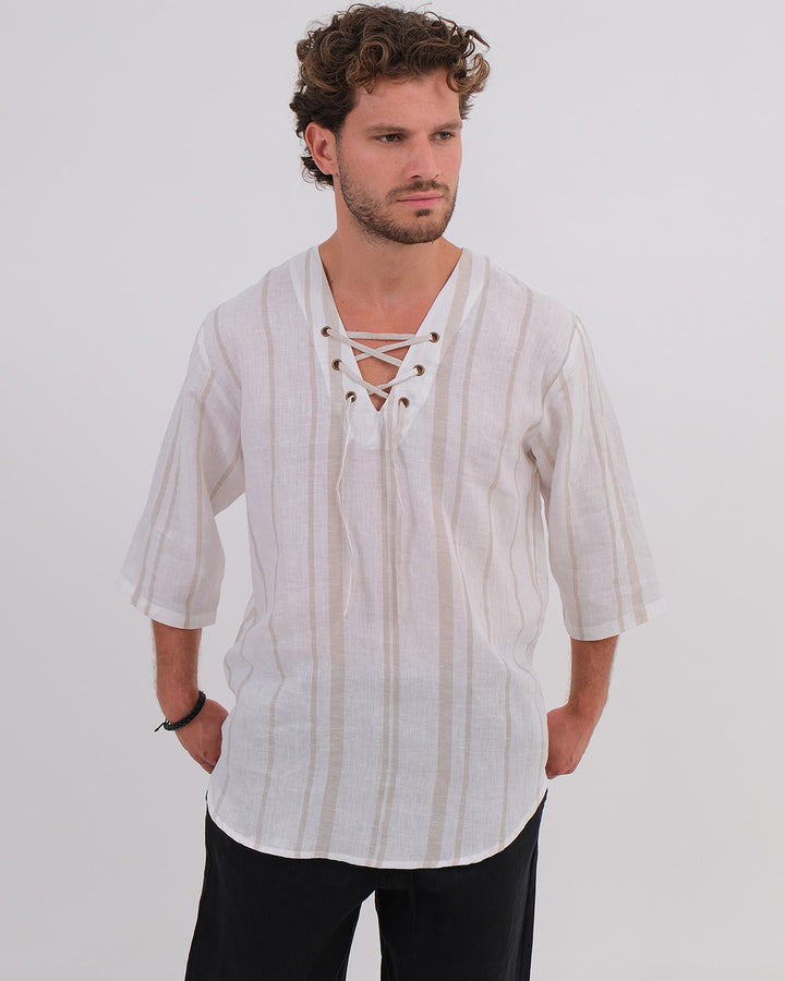 Elevate your casual vibe with this playful duo! The 100% linen V-neck shirt in beige stripes brings light, breezy charm, while the black linen long pants offer cool comfort. Together, they’re your go-to outfit for easy style and fun flair wherever you roam.